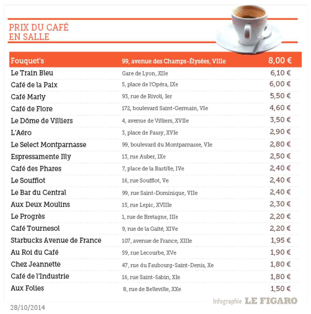 Ainsi, le prix moyen d'un café suivant leur échantillon est de 3,20€. Le café coûtant le plus cher se trouve au "Fouquet's", avenue des Champs-Élysées, et vaut 8€. Au contraire, le plus abordable est à Belleville, dans le 10ème arrondissement, à 1,50€ "Aux Folies".