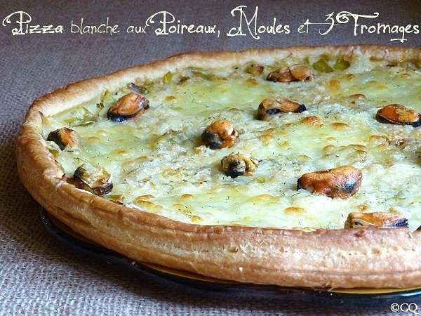 Pizza blanche aux poireaux, moules et 3 fromages