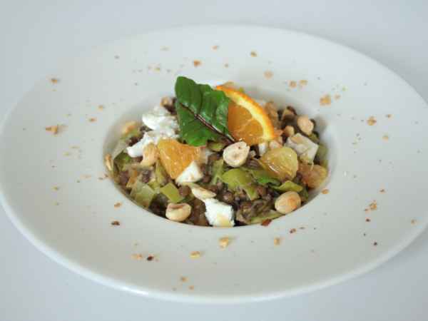 Salade de lentilles aux poireaux, noisettes, orange & chèvre