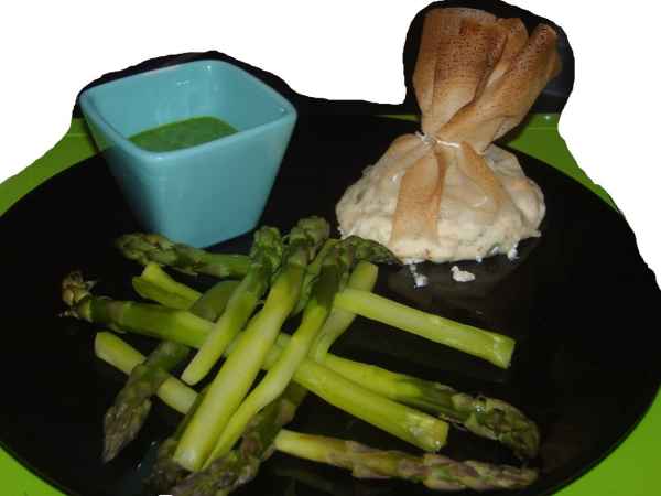 Aumonière de brousse & menthe, asperges & emulsion de roquette