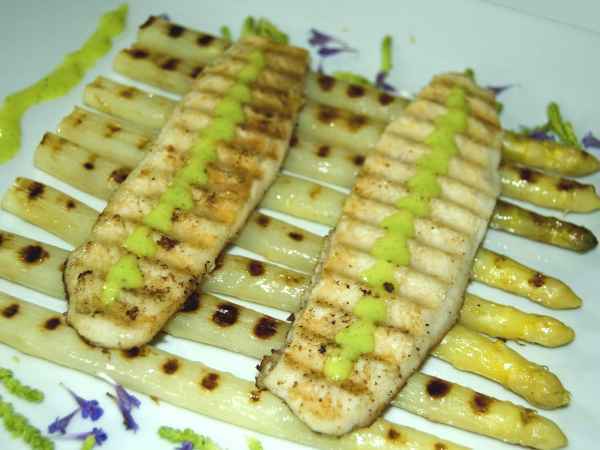 Asperges grillées, filets de bar