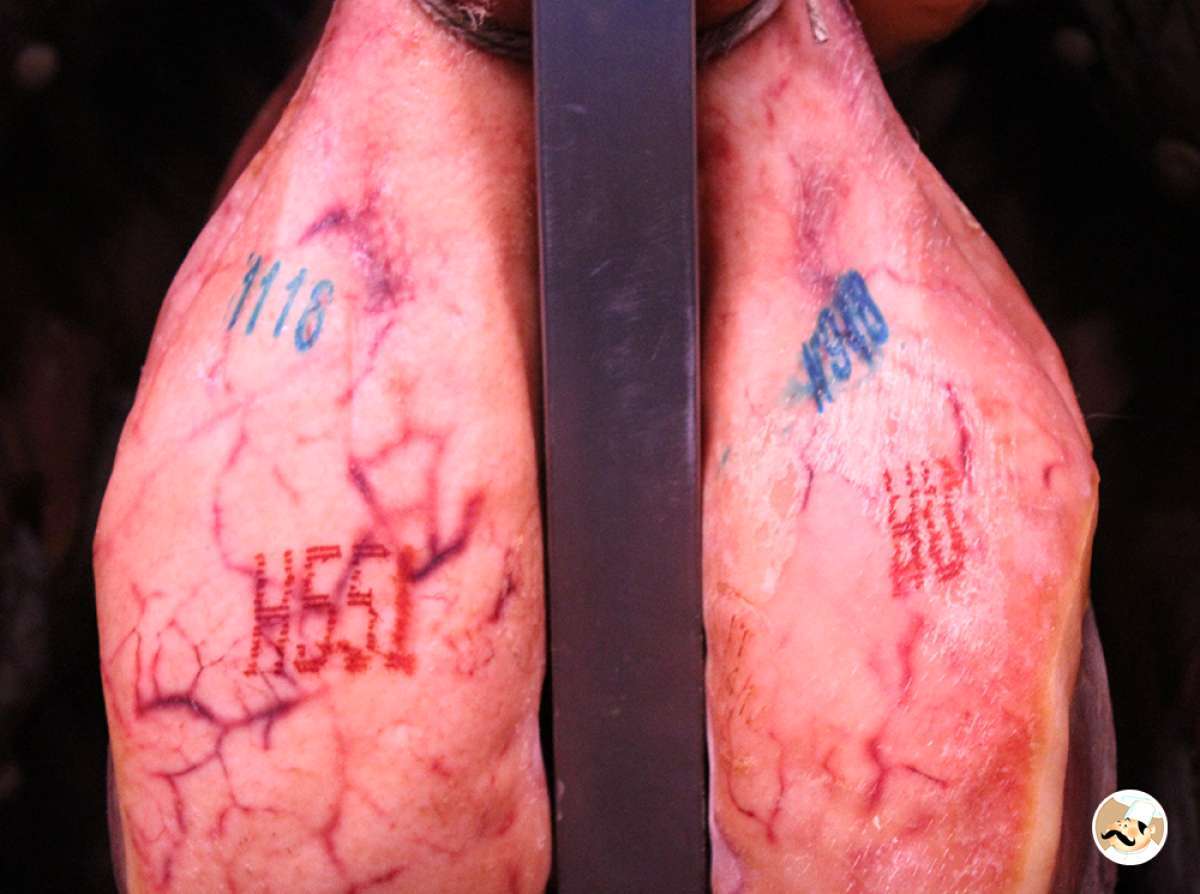 Après son abattage, la cuisse postérieure du porc est isolée, refroidie à 0°C pendant 24 heures, puis rognée pour obtenir une jolie forme escomptée. Les cuisses sont alors datées à l’aide d’une petite plaque incrustée dans la couenne afin de pouvoir passer à la phase de salaison.