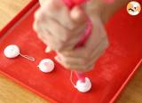 Verser le mélange blanc dans une poche à douille et former de petits tas sur la plaque.
