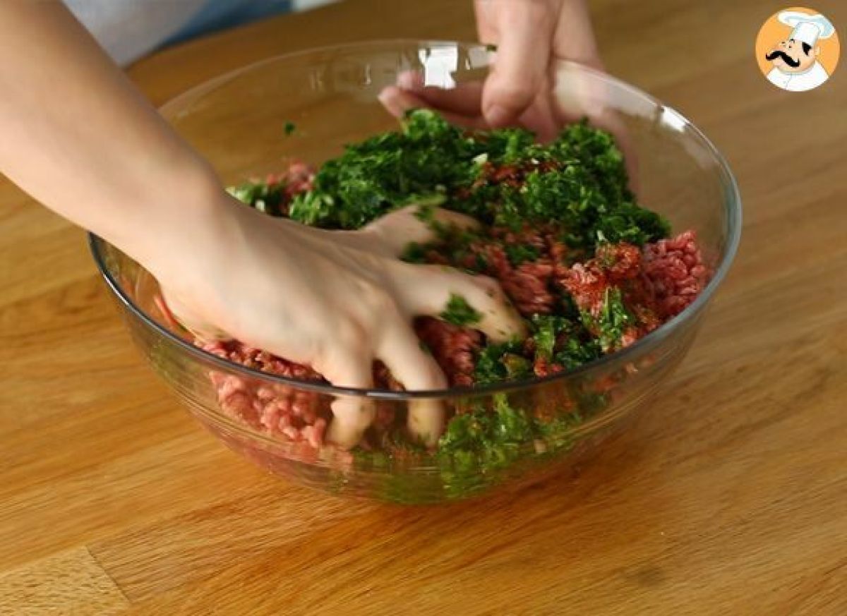 Ajoutez ce mélange dans le saladier et mélangez-le bien à la viande avec vos mains.