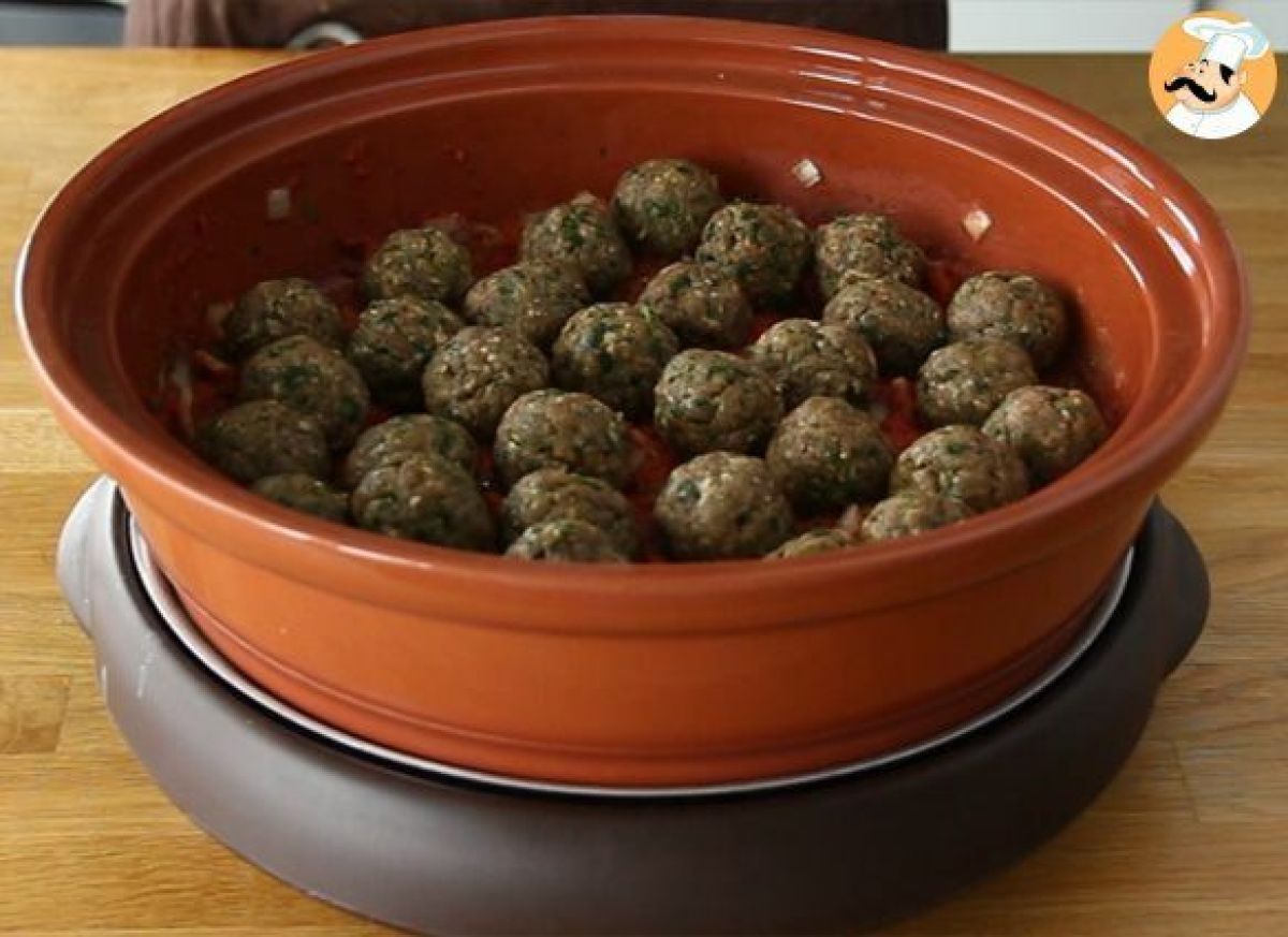Prélevez un peu de viande et formez des boulettes de la taille d'une balle de ping-pong. Placez-les au fur et à mesure dans le tajine, sur le mélange à base de pulpe de tomate.