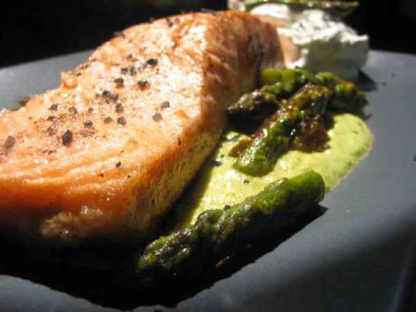 Pavé de saumon, crème d'asperge et chantilly à l'aneth