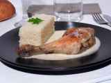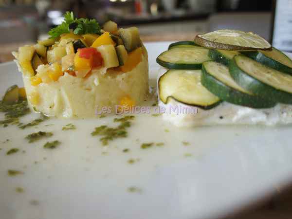 Cabillaud en ecailles de courgette et galette de légumes au cumi