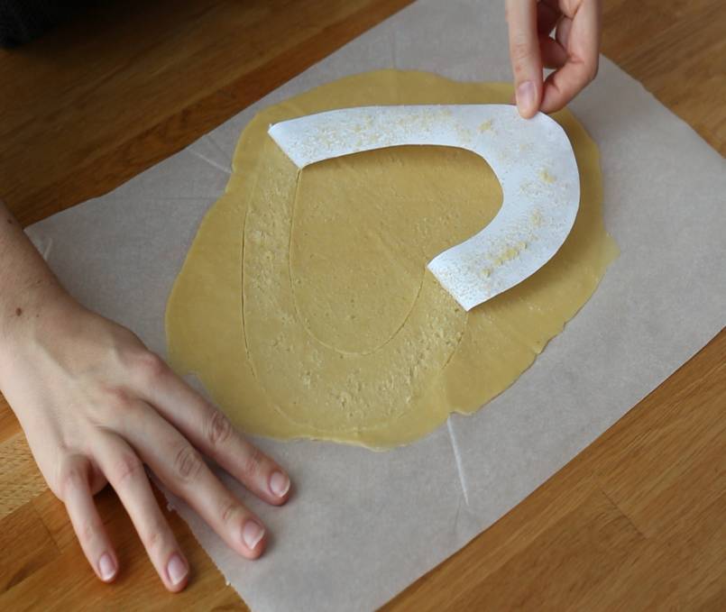 Dessiner ou imprimer une forme de demi cœur sur une feuille A4, découper la forme puis la placer sur la pâte. Couper les contours du demi cœur, replacer la forme symétriquement et couper la deuxième moitié du cœur.