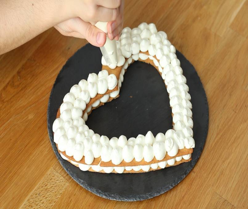 Poser le deuxième cœur en pâte sablée sur la crème et pocher à nouveau de la crème dessus.