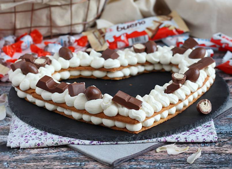 La Saint-Valentin approche à grands pas et si vous voulez faire plus qu'offrir des fleurs ou des chocolats, ce gâteau en forme de cœur fait maison est la solution. Nous prendrons une pâte sablée (maison ou achetée) et la découperons en forme de cœur, nous la remplirons d'une crème de mascarpone soyeuse aromatisée à la vanille et nous finirons par la décorer de chocolats Kinder pour la rendre plus belle.