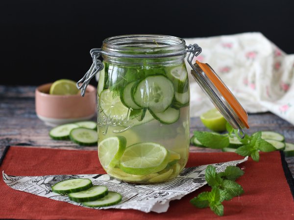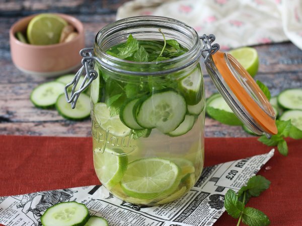 L'eau aromatisée au concombre, citron vert, menthe et gingembre