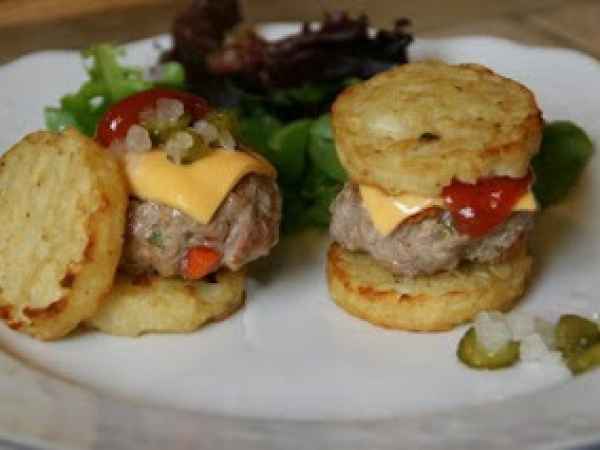 Mini-hamburgers de röstis et steaks hachés maison aux poivrons