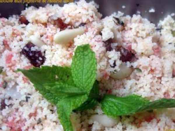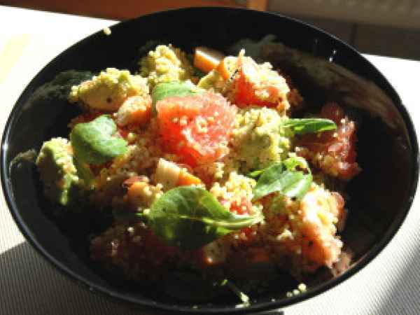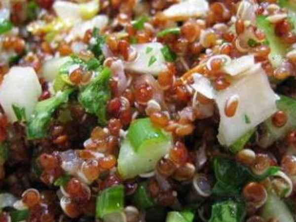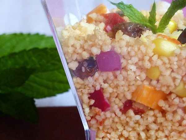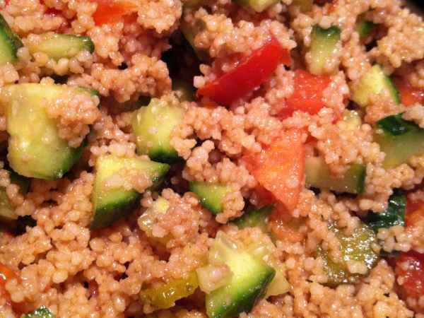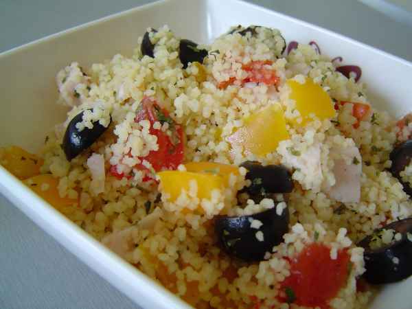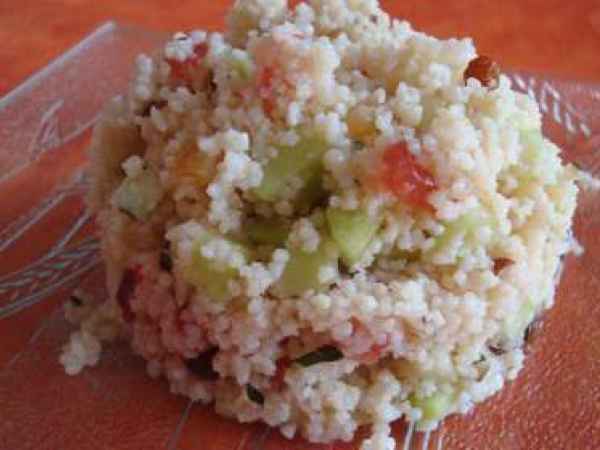 Cette salade peut être préparée avec du couscous ou du boulghour. Le couscous est un type de féculents fins fabriqués à partir de farine de blé dur ou de farine de millet. Le boulghour est fait de grains de blé grossièrement moulu. La préparation est la même: à la vapeur ou trempée dans de l'eau chaude.
