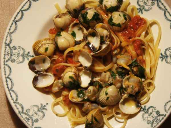 Spaghettis aux coques, sauce à la tomate, à l’ail et au persil