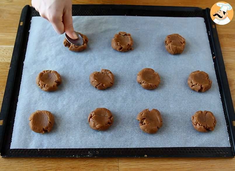 Pour rendre vos biscuits ultra appétissants, faites fondre un peu de pâte à tartiner aux spéculoos dans votre micro-ondes. Pendant ce temps, formez de petits puits sur le dessus de vos biscuits lorsqu'ils sont encore tièdes. Faites-y couler la pâte à tartiner fondue et placez le tout au réfrigérateur pendant 10 minutes le temps que ça durcisse.