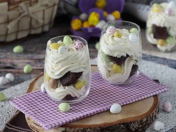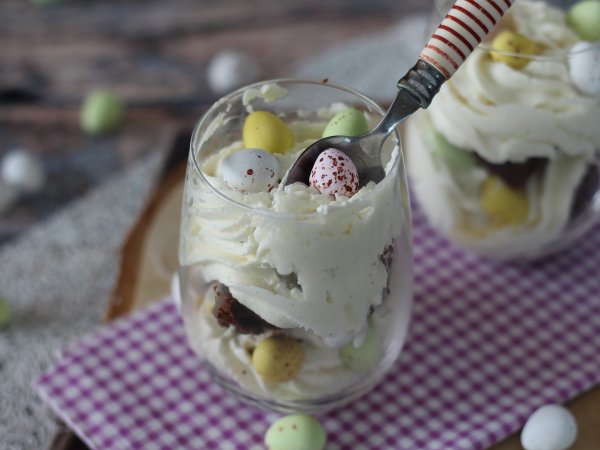 Et si vraiment vous êtes pris par le temps, 2 recettes express devraient vous sauver la mise: nos oeufs garnis et nos verrines. Dans le premier cas, vous pourrez utiliser des oeufs en chocolat que vous viendrez garnir d'une crème dessert puis parsemer de friandises colorées (le tout à dévorer avec les doigts). Dans le second, vous pourrez associer des morceaux de brownies (fait la veille par exemple) avec une crème chantilly et des oeufs en chocolat. 2 recettes qui seront aussi anti-gaspillage à garder sous la main pour utiliser ses oeufs de Pâques après la fête!