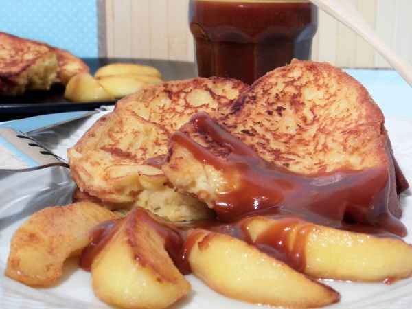 Brioche perdue aux pommes dorées et sauce caramel au beurre salé