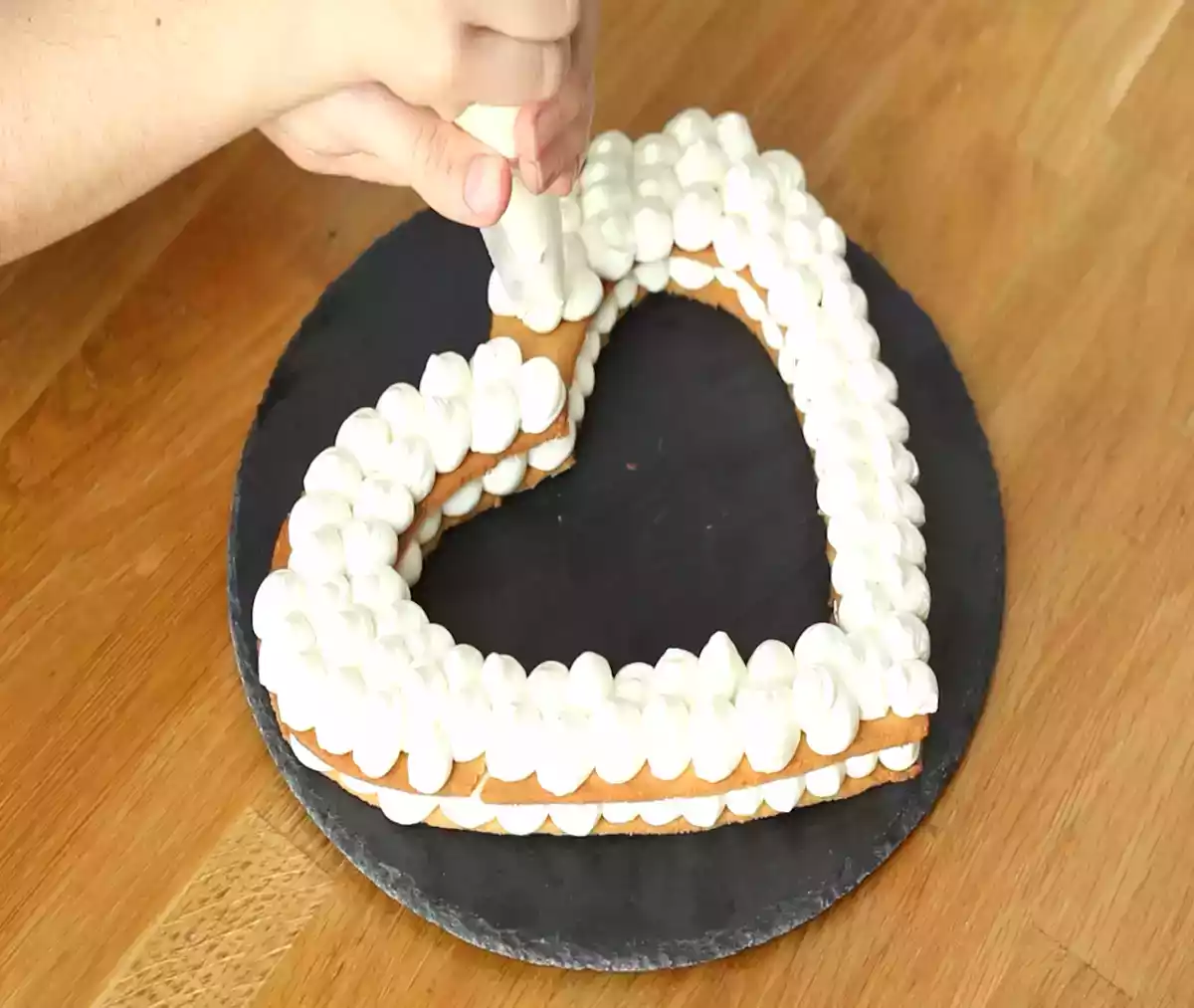 Poser le deuxième cœur en pâte sablée sur la crème et pocher à nouveau de la crème dessus.