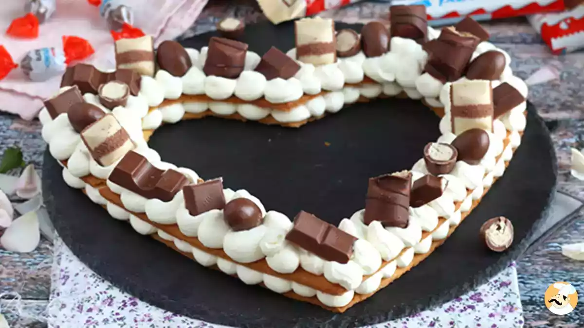 La Saint-Valentin approche à grands pas et si vous voulez faire plus qu'offrir des fleurs ou des chocolats, ce gâteau en forme de cœur fait maison est la solution. Nous prendrons une pâte sablée (maison ou achetée) et la découperons en forme de cœur, nous la remplirons d'une crème de mascarpone soyeuse aromatisée à la vanille et nous finirons par la décorer de chocolats Kinder pour la rendre plus belle.