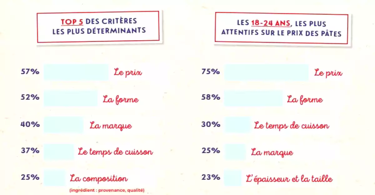 Dans un contexte d’inflation, le prix reste le premier critère de choix pour 75 % des répondants. Avec un pouvoir d’achat souvent serré, surtout chez les plus jeunes, il n’est pas surprenant que la marque et la composition des pâtes viennent ensuite dans la liste des priorités. En effet, 57 % des sondés se disent sensibles au prix, ce qui souligne l’importance de faire des choix judicieux.