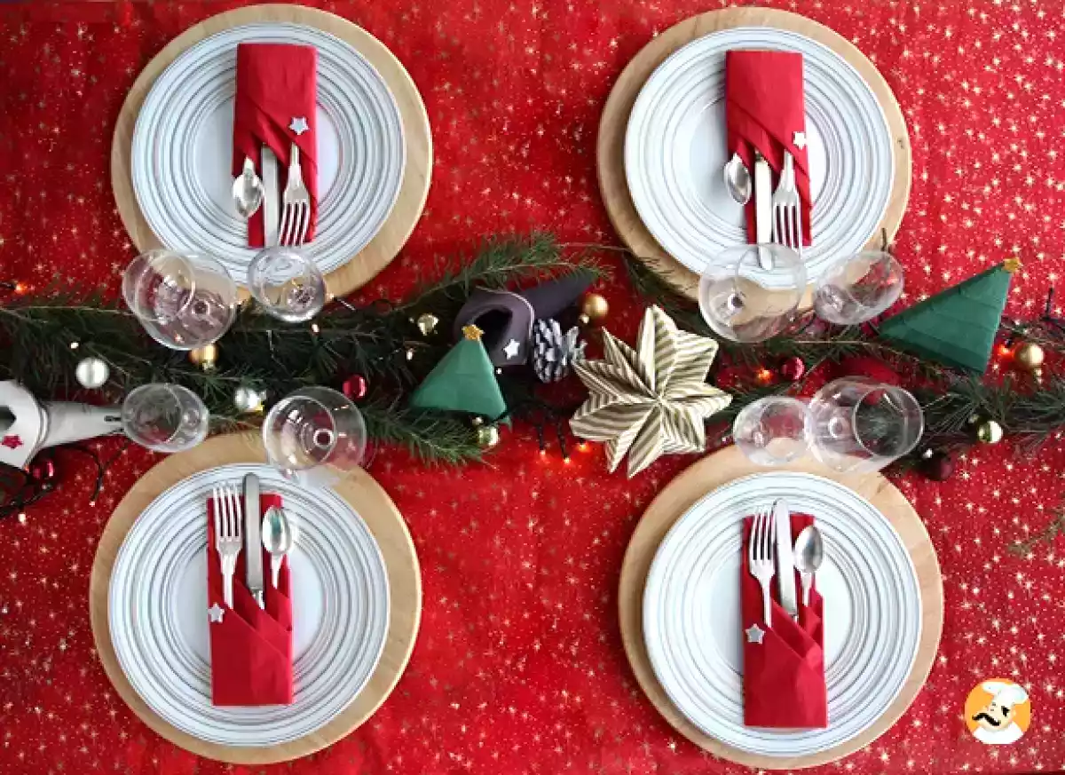 L'idée est simple: après avoir mis une jolie nappe sur votre table et sorti votre plus belle vaisselle, allez prendre l'air et profitez-en pour couper quelques branches de sapin. En plus d'apporter une douce odeur naturelle à votre pièce, elles conviendront parfaitement en guise de chemin de table. Ajoutez des boules de Noël et... des serviettes!