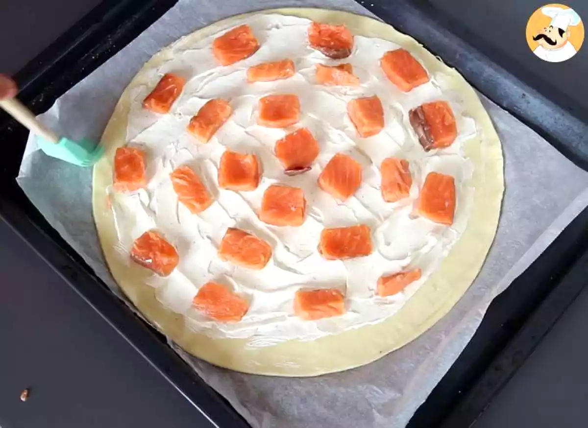 Ici, ce sont deux pâtes feuilletées rondes que nous avons utilisées et garnies d'un savoureux mélange de fromage frais et de saumon. Pour la forme, et afin de coller au thème de l'hiver et de Noël, on n'a pas pu s'empêcher de lui donner des allures de flocons.