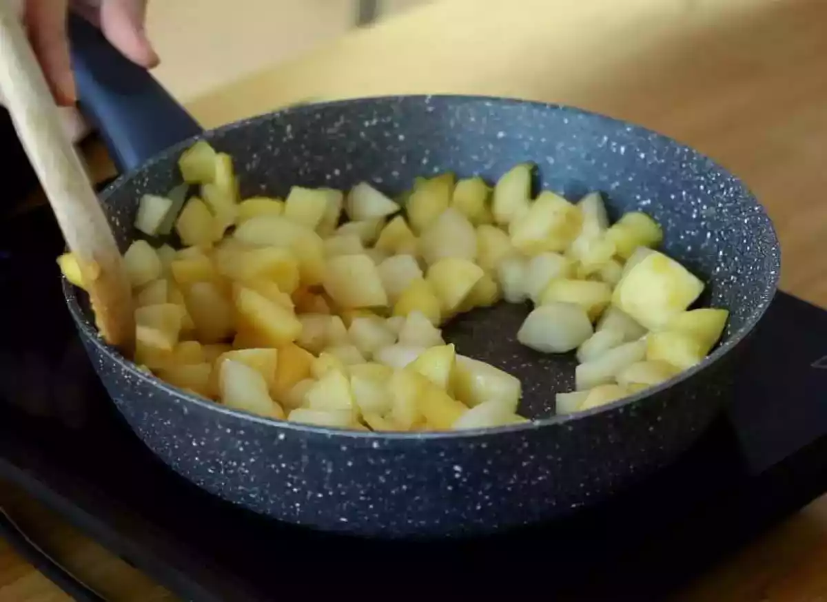 Pelez et coupez les fruits en morceaux puis faites-les revenir une dizaine de minutes dans une poêle sur feu moyen.