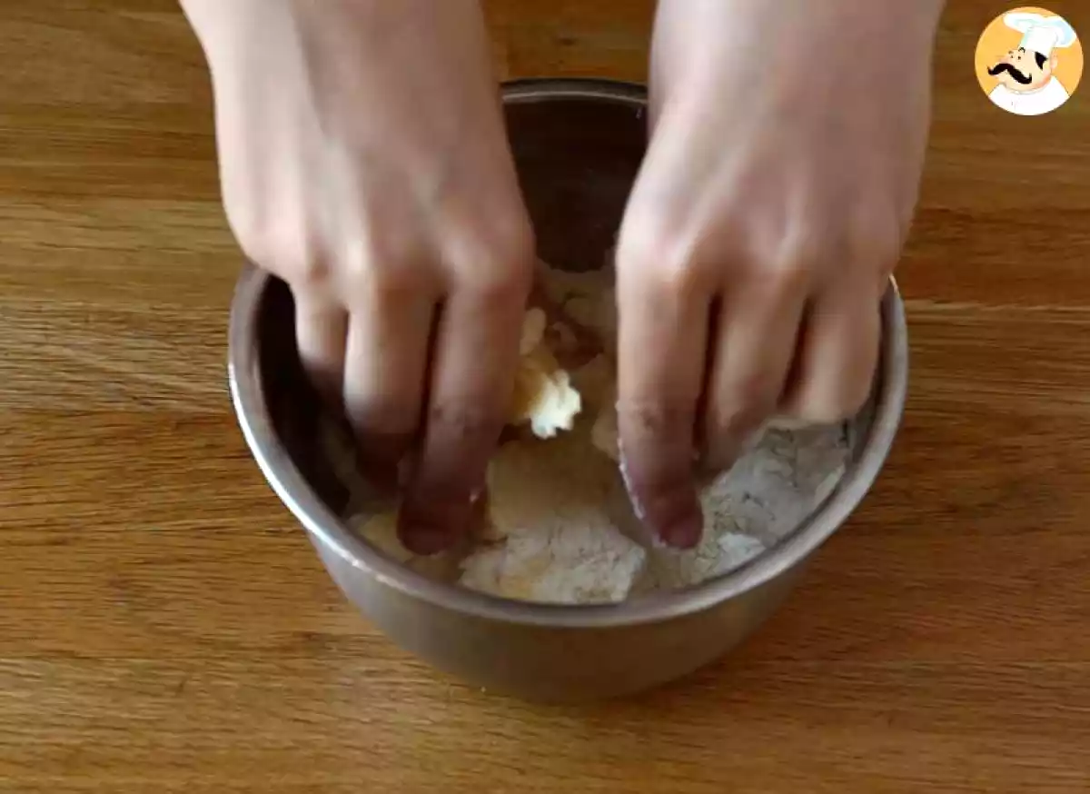 Coupez le beurre froid en cubes et mélangez-le avec la farine, le sucre et la poudre d'amandes. Allez-y avec les doigts afin de donner cet effet "poudre crumble" qu'on aime tant.