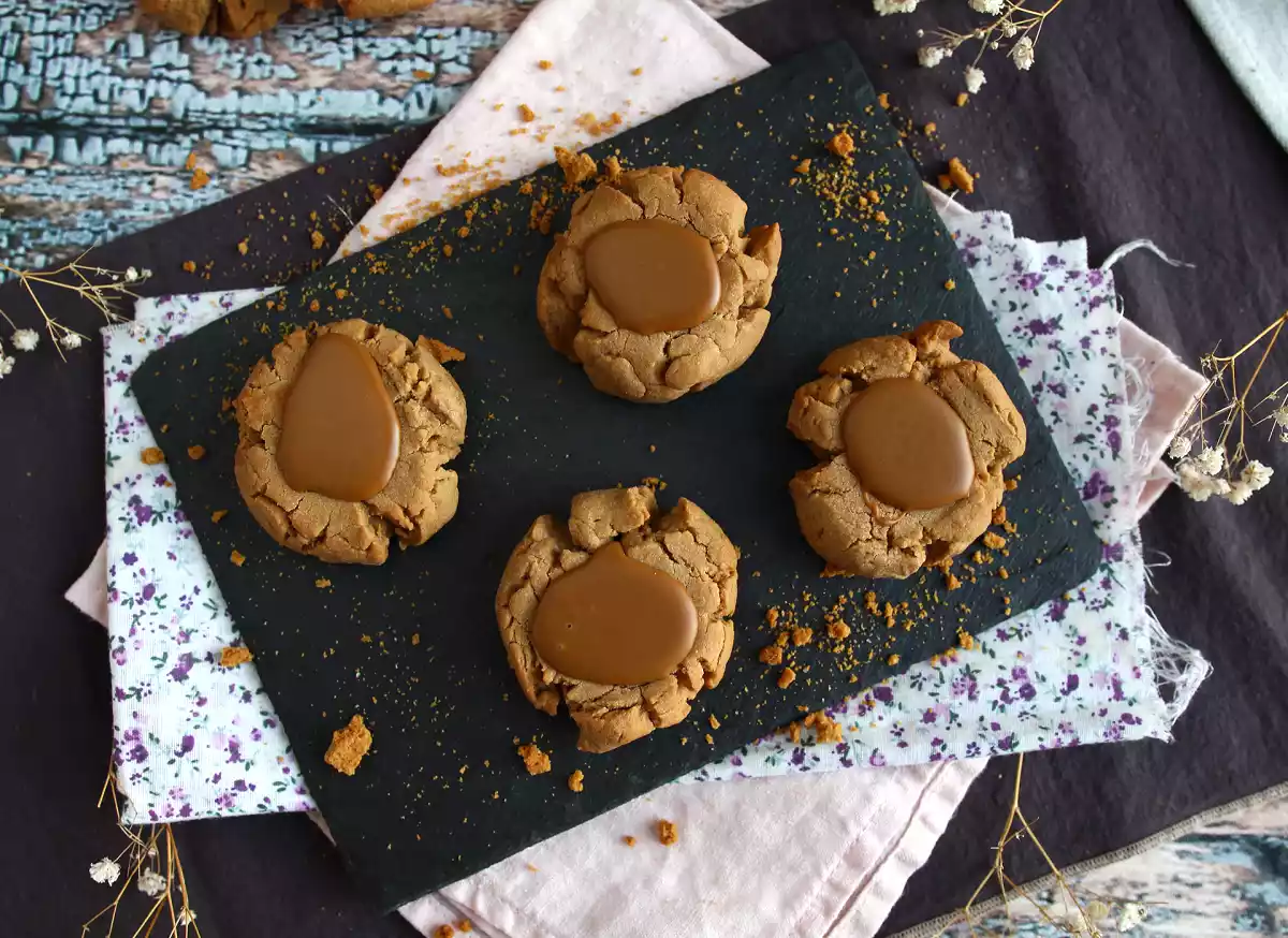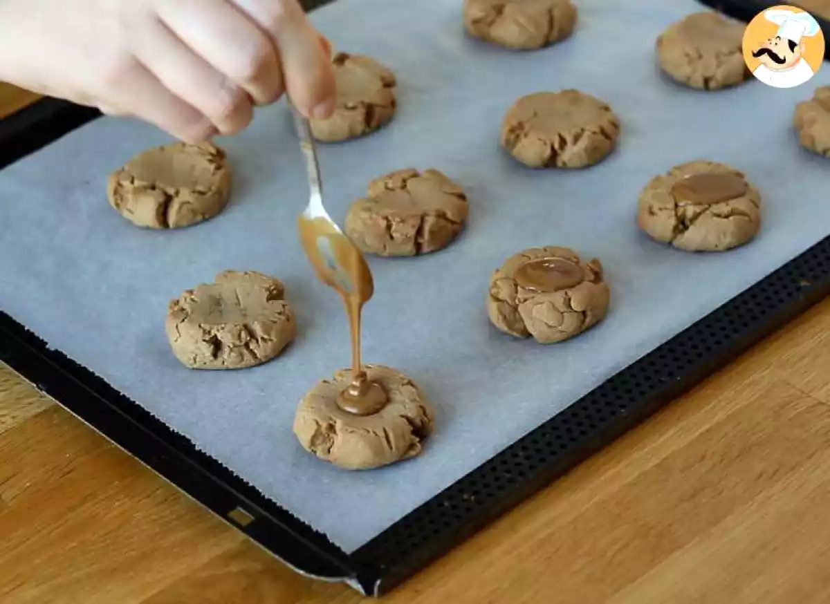 Pour rendre vos biscuits ultra appétissants, faites fondre un peu de pâte à tartiner aux spéculoos dans votre micro-ondes. Pendant ce temps, formez de petits puits sur le dessus de vos biscuits lorsqu'ils sont encore tièdes. Faites-y couler la pâte à tartiner fondue et placez le tout au réfrigérateur pendant 10 minutes le temps que ça durcisse.
