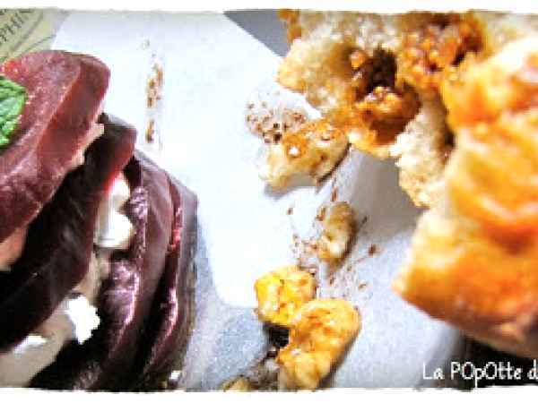Millefeuille betterave chèvre frais, vinaigrette aux noix