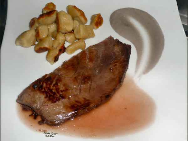 Magret de canard à la cerise, gnocchis d'ocas du pérou.