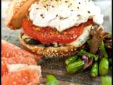 Bagel aux asperges et champignons, gratiné au cheddar fort et oeuf poché