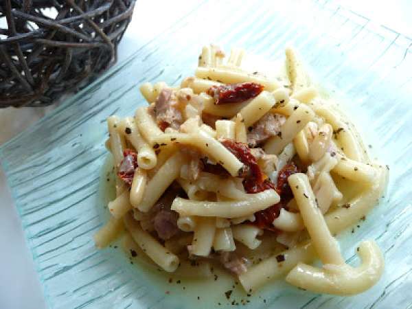 Risotto de pâtes aux tomates séchées, basilic, thon et pignons