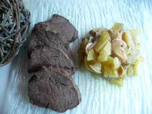 Rôti de boeuf et sa garniture pommes de terre au champignons.