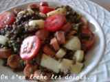 Salade de lentilles , saucisses, tomates, emmental.