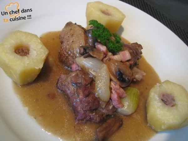 Ragoût d'oie à l'ancienne, pommes de terre farcies