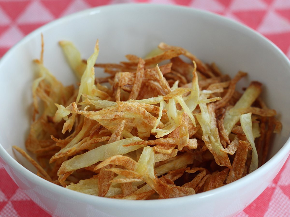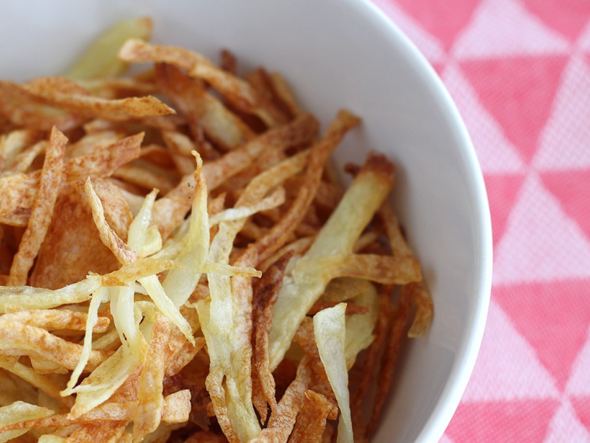 Des chips extra fines et surtout bien croustillantes pour l'apéritif, ça vous tente ? Munissez-vous de votre plus beau couteau, tranchez votre pomme de terre le plus finement possible puis placez le tout quelques minutes au four, le temps d'accueillir vos invités ;-) N'hésitez pas non plus à garder cette idée recette en guise d'accompagnement pour vos viandes / poissons ou encore à l'utiliser en salade (comme c'est le cas dans la Salpicão brésilienne ;-) )