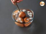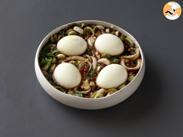 Placer les œufs écalés dans la marinade. Recouvrir de film alimentaire ou refermer la boite hermétique et placer au réfrigérateur pendant au moins 6 heures.