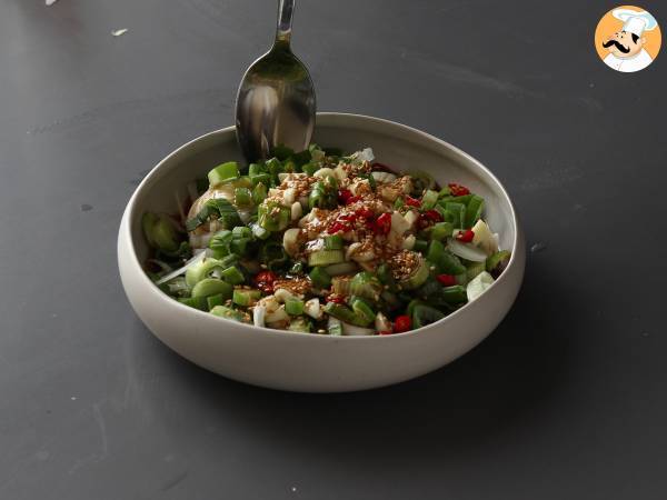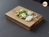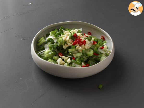 Couper les oignons verts, les piments, les gousses d'ail en petits morceaux.
