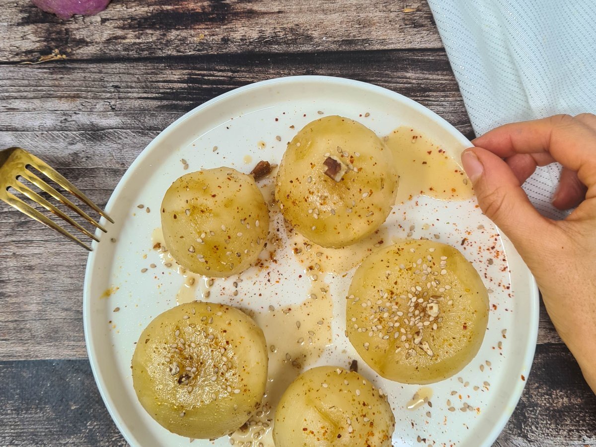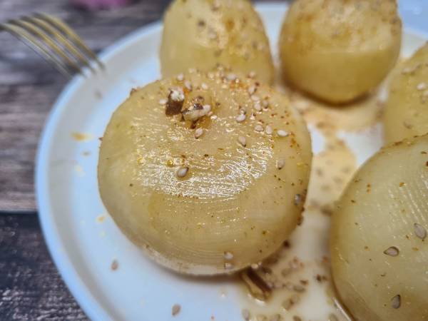 Ajoutez par dessus quelques noix concassées ou quelques graines, pour un peu de croustillant qui se mariera à merveille avec le fondant du navet