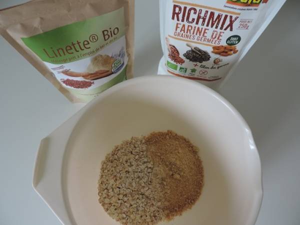 Dans un saladier, mélanger la farine de graines germées, la linette, les flocons d'avoine, le sel et le bicarbonate.