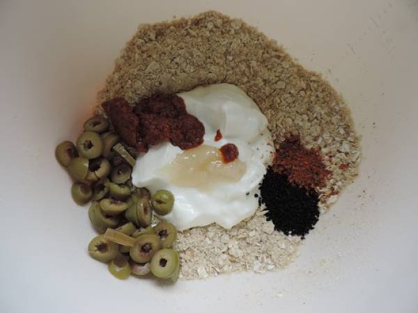 Faire un puits et y ajouter les olives vertes finement coupées, l'oeuf battu, le yaourt, le miel, la crème de tomates, les graines de nigelle.