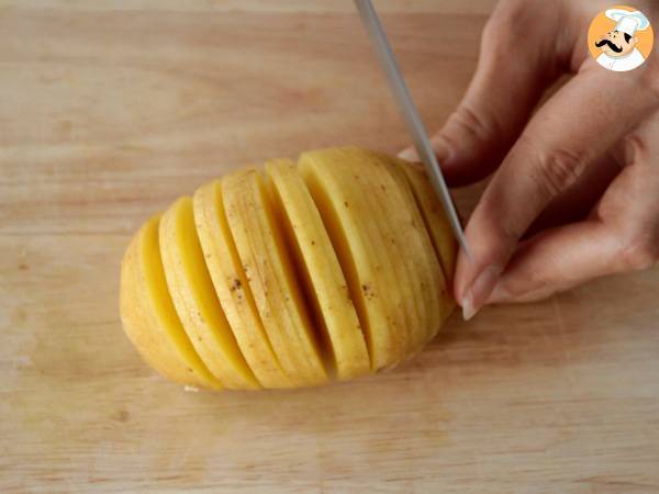 Après les avoir bien nettoyées, coupez la pomme de terre en lamelles de 3 mm d'épaisseur, en faisant bien attention de ne pas couper jusqu'au bout. (Vous pouvez placer des baguettes chinoises de chaque côté de votre pomme de terre pour faire butoir)