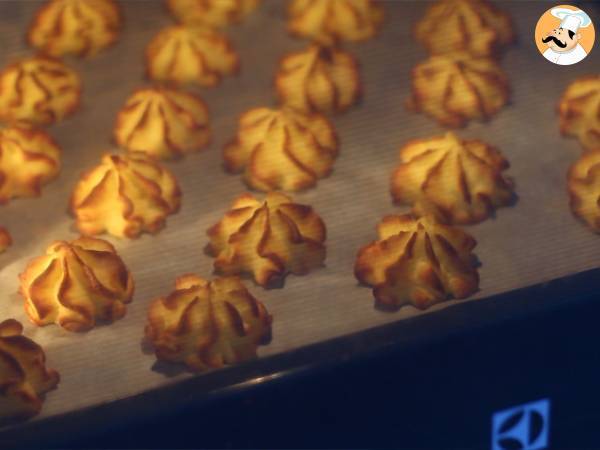 Remplissez une poche à douille munie d'une douille cannelée de la purée obtenue, et formez vos pommes duchesses sur une plaque de cuisson couverte de papier sulfurisé.