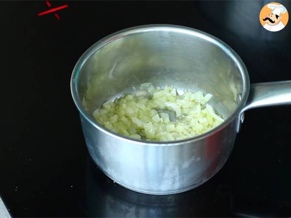 Dans une casserole, versez de l’huile d’olive. Ajoutez de l’oignon coupé en petits dés, puis faites les revenir jusqu’à ce qu’ils soient cuits.