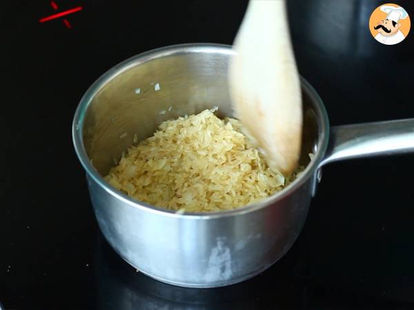Versez votre riz et mélangez jusqu’à ce que les grains deviennent translucides.