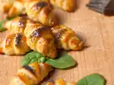 Ingrédients: INGREDIENTS(pour 16 mini-croissants): -1 pâte feuilletée -2 tranches de jambon -2 c à soupe de crème fraîche -50g de gruyère râpé -1 jaune d'oeuf