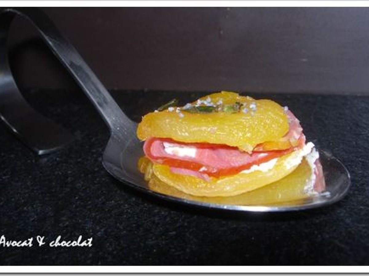 Abricot moelleux farcis au fromage frais et basilic, pavot