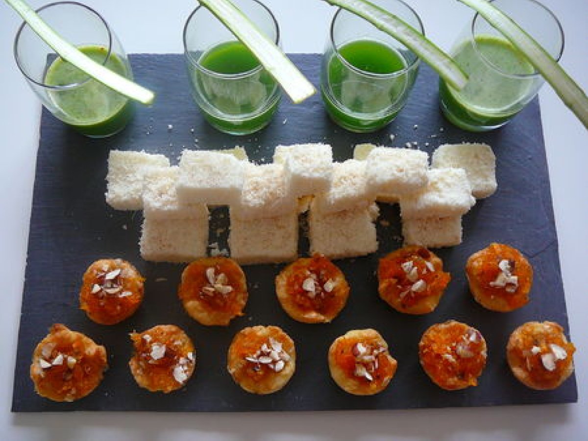 Amuses-bouches : tartelettes à la carotte confite et cardamome / guimauves de parmesan /