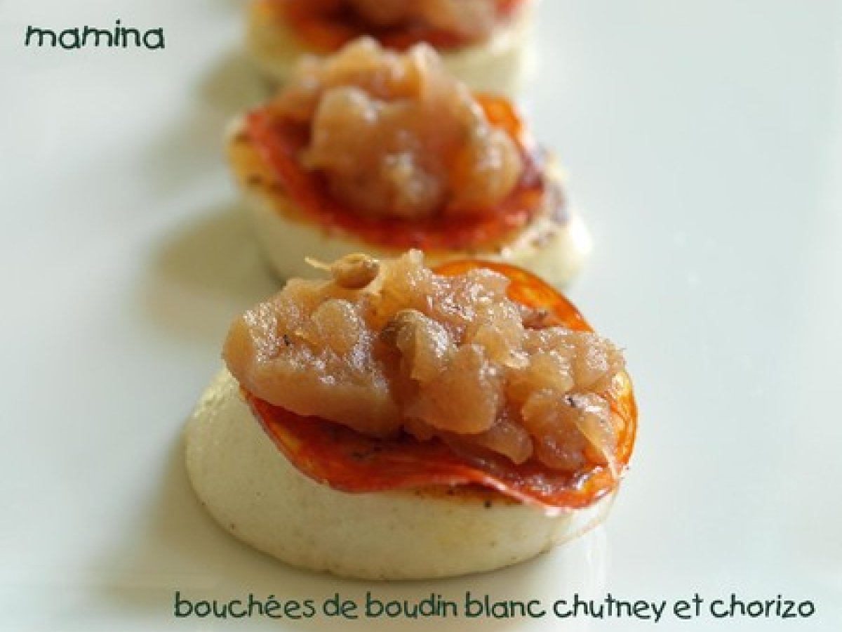 Couper les boudins en biseau en tranches de 4 ou 5 mm d'épaisseur. Les faire revenir quelques secondes à la poêle sur une seule face pour les réchauffer. - Poser sur le côté non "cuit" une fine tranche de chorizo et un noisette de chutney à température ambiante.